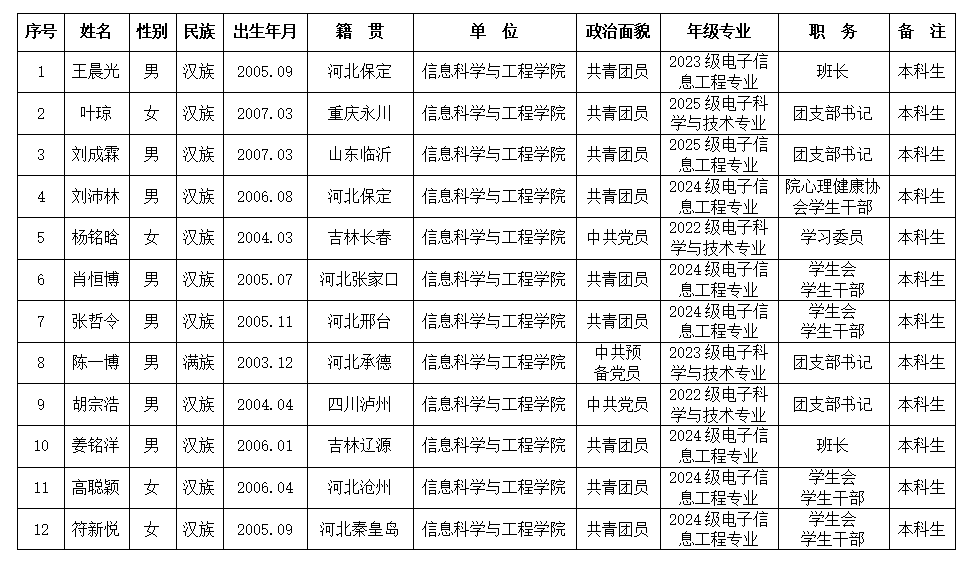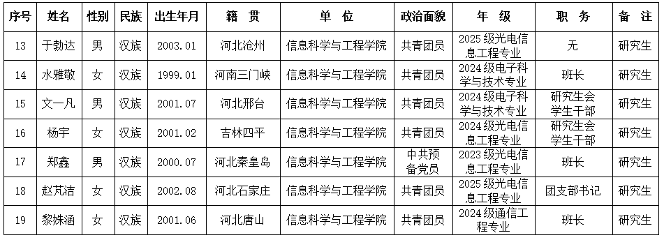 信息科学与工程学院出席燕山大学第十七次学生代表大会、燕山大学第九次研究生代表大会代表名册
