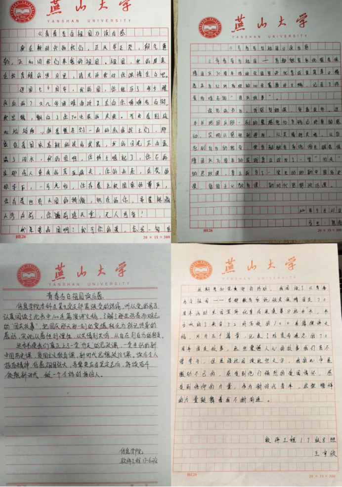 刘华栋写到:70载,恢宏壮阔的发展画卷,中华厚重的历史影响着我,让我体会—芸芸众生的卓著功勋;祖国明亮的眼眸牵引着我,让我感触一个泱泱大国的伟大时代。当南海边上的紫荆花盛情绽放,《七子之歌》在人们口中传唱,五星红旗高高飘扬在港澳特别行政区,也飘扬在港澳人的心中。坚持"一国两 制”的基本国策为台湾回归筑起了一座永不垮塌的桥梁。在那百花盛开的阿里山,一位位同胞们在尽情地欢唱。当神圣的奥林匹克圣火第一次走进龙的故乡,四海宾朋相聚在古老的礼仪之邦。坚贞不屈的中华民族终于为祖国赢得了国际社会的普遍尊重,信任与青睐。在礼花高绽的鸟巢,一面面五环旗挥动着时代的节拍。那时,自豪的我看到了一个 民 族奔跑的姿态,见证了—民族不息的辉煌。风雨几重,春秋几度,日月流转,万象复苏。我与祖国一道迎来了缤纷的时代,我与祖国一起跨进了一个崭新的纪元!我们一起为祖国祝福,祖国的明天更加美好。
