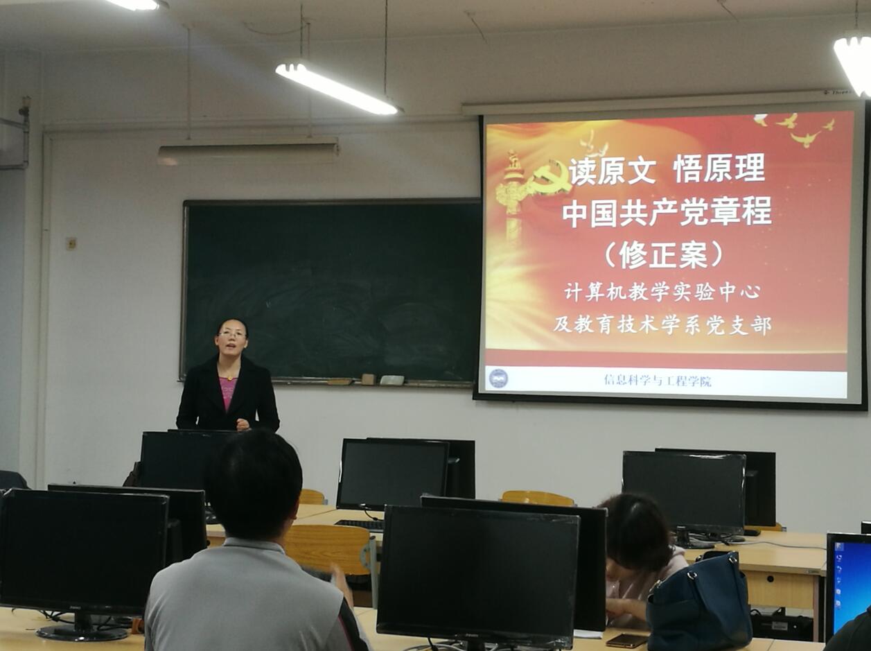 12月21日,计算机教学实验中心与教育技术学系党支部继续开展“读原文 悟原理”系列学习活动。本次学习依然采用线上线下相结合的学习模式,支部书记巢进波同志提前在支部群里发布了中国共产党章程修正案的相关学习资料,全体党员认真完成了原文阅读并深入思考,然后在信息馆421实验室召开支部大会,面对面交流学习感悟。