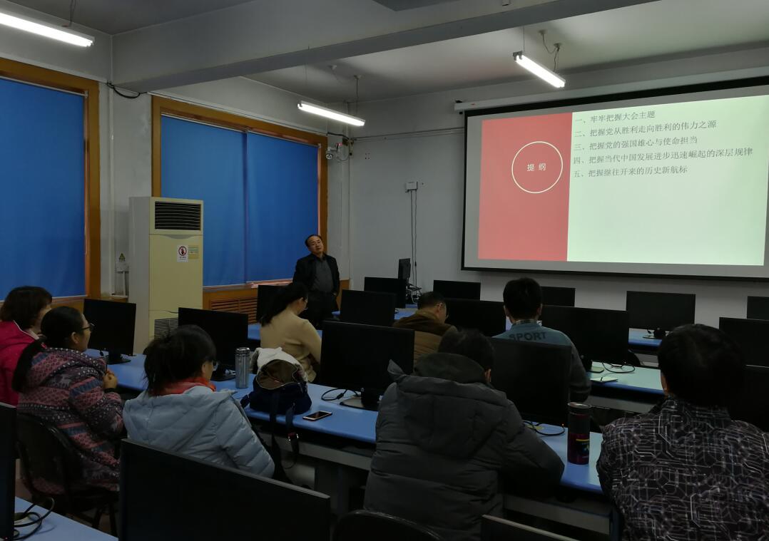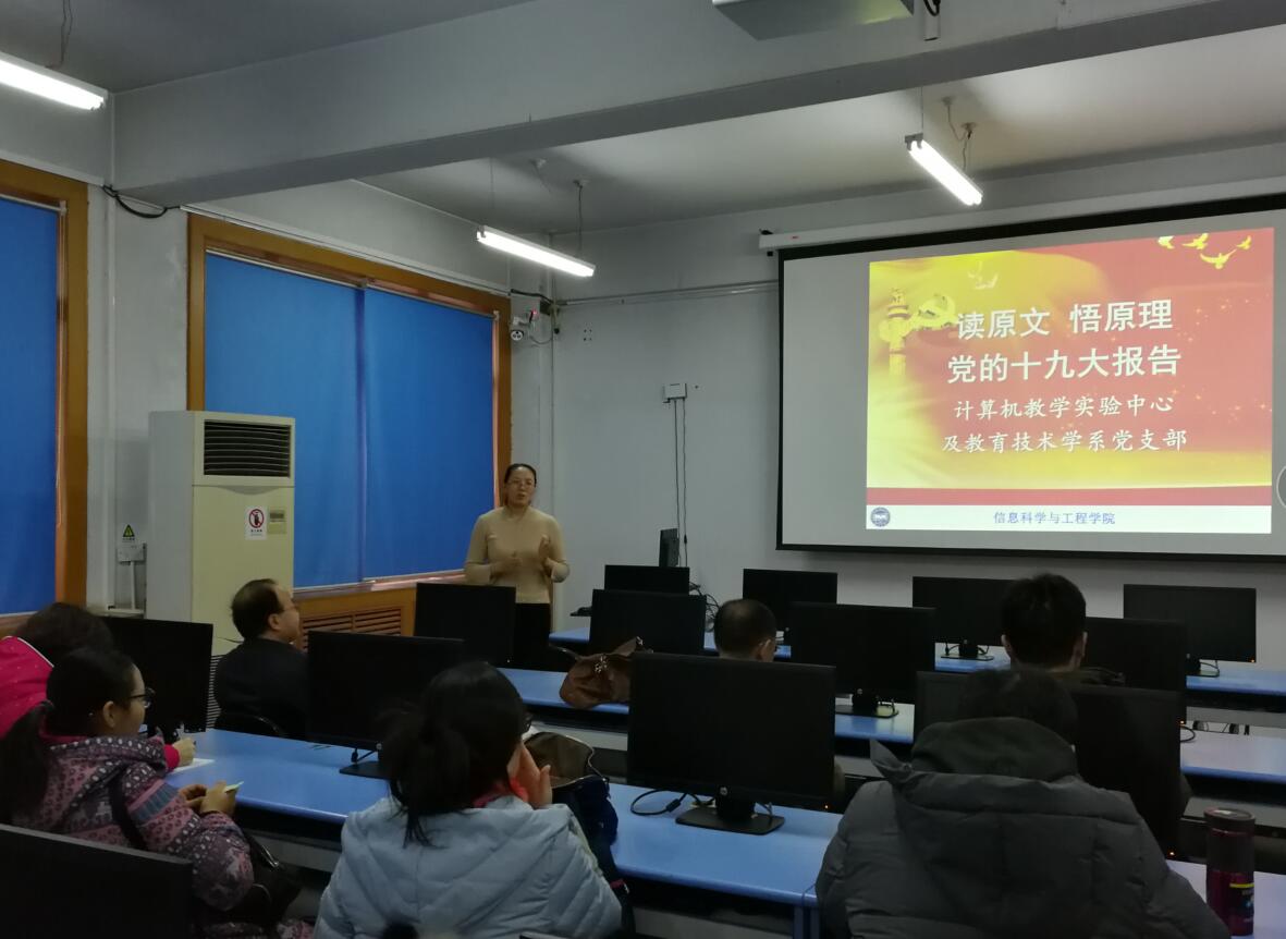 12月14日,计算机教学实验中心与教育技术学系党支部开启了“读原文 悟原理”的系列学习活动。本次学习采用线上线下相结合的学习模式,支部书记巢进波同志提前在支部群里发布了十九大报告全文和学习要求,全体党员认真完成了原文阅读并深入思考,然后召开支部大会,面对面交流学习感悟。