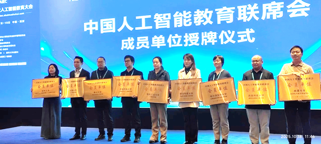 10月18日,2025全国高校人工智能教育大会(AIEC 2025)在陕西省西安市成功举办。会议由教育部高等学校计算机类专业教学指导委员会、中国人工智能教育联席会等联合主办,西安交通大学承办,汇聚了郑南宁、郑庆华等多位院士及全国高校人工智能领域的专家学者,围绕人工智能人才培养、专业培养体系建设、专业课程设置、人工智能领域“101”计划、产教融合等热点话题展开深度交流。我校信息科学与工程学院入选“中国人工智能教育联席会”会员单位,计算机科学与工程系主任吴培良参加授牌仪式。