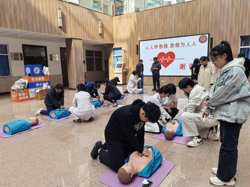 本次培训特邀校医院专业医护团队进行系统授课。培训聚焦“心肺复苏(CPR)与自动体外除颤器(AED)使用”及“常见意外伤害现场处置”两大核心模块。校医院培训师通过理论讲解、案例分析和视频演示,深入浅出地阐述了应急救护的“黄金4分钟”理念、现场评估、呼叫求援的基本流程,并重点讲解了胸外按压的深度频率、人工呼吸要点、AED操作流程以及创伤止血、包扎固定、气道异物梗阻急救(海姆立克急救法)等实用技能。